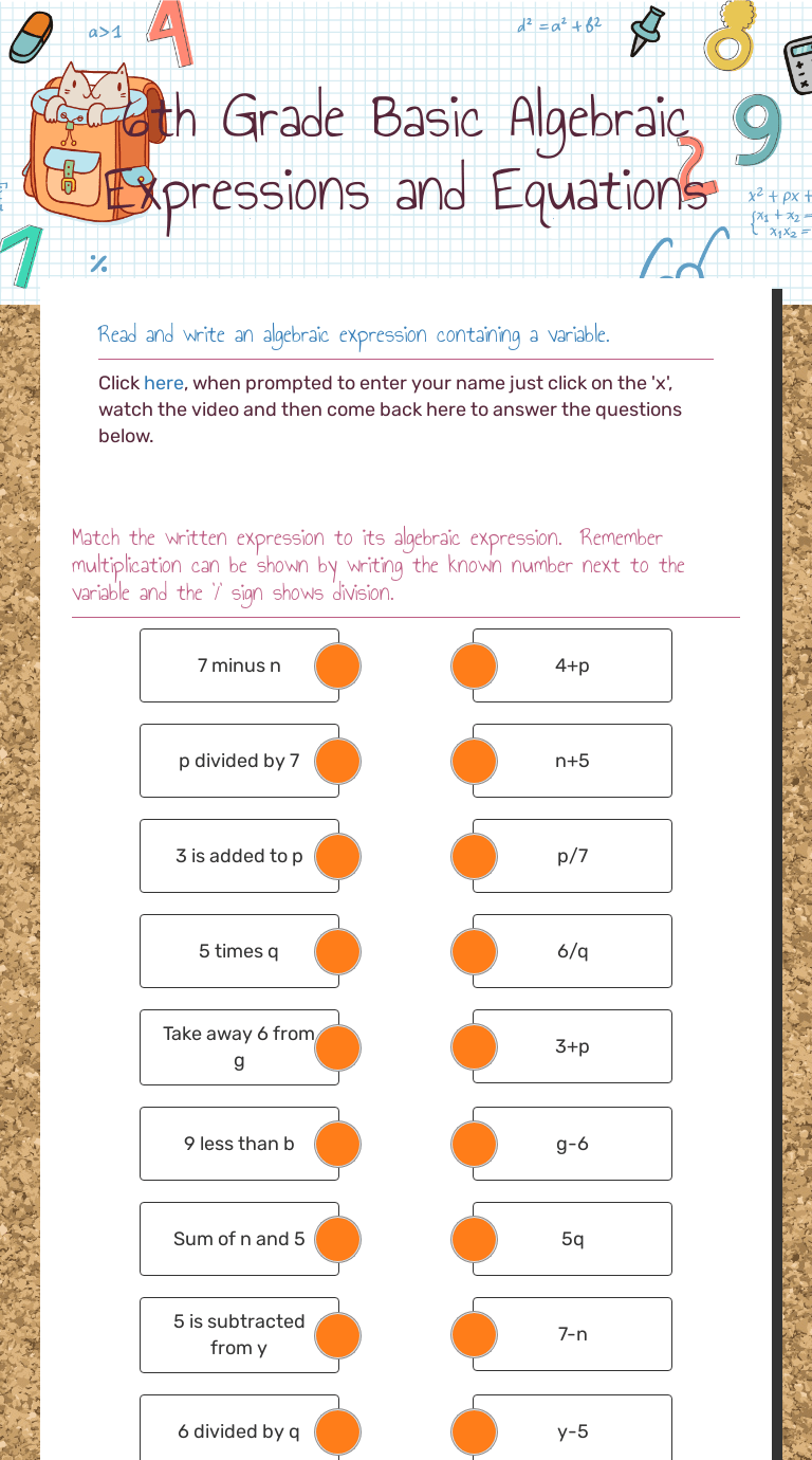 6th Grade Basic Algebraic Expressions and Equations Interactive