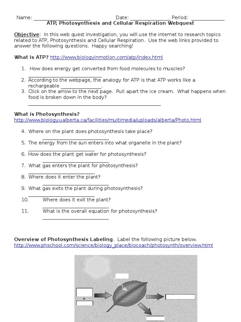 Atp Photosynthesis And Cellular Respiration Webquest Worksheet Answer