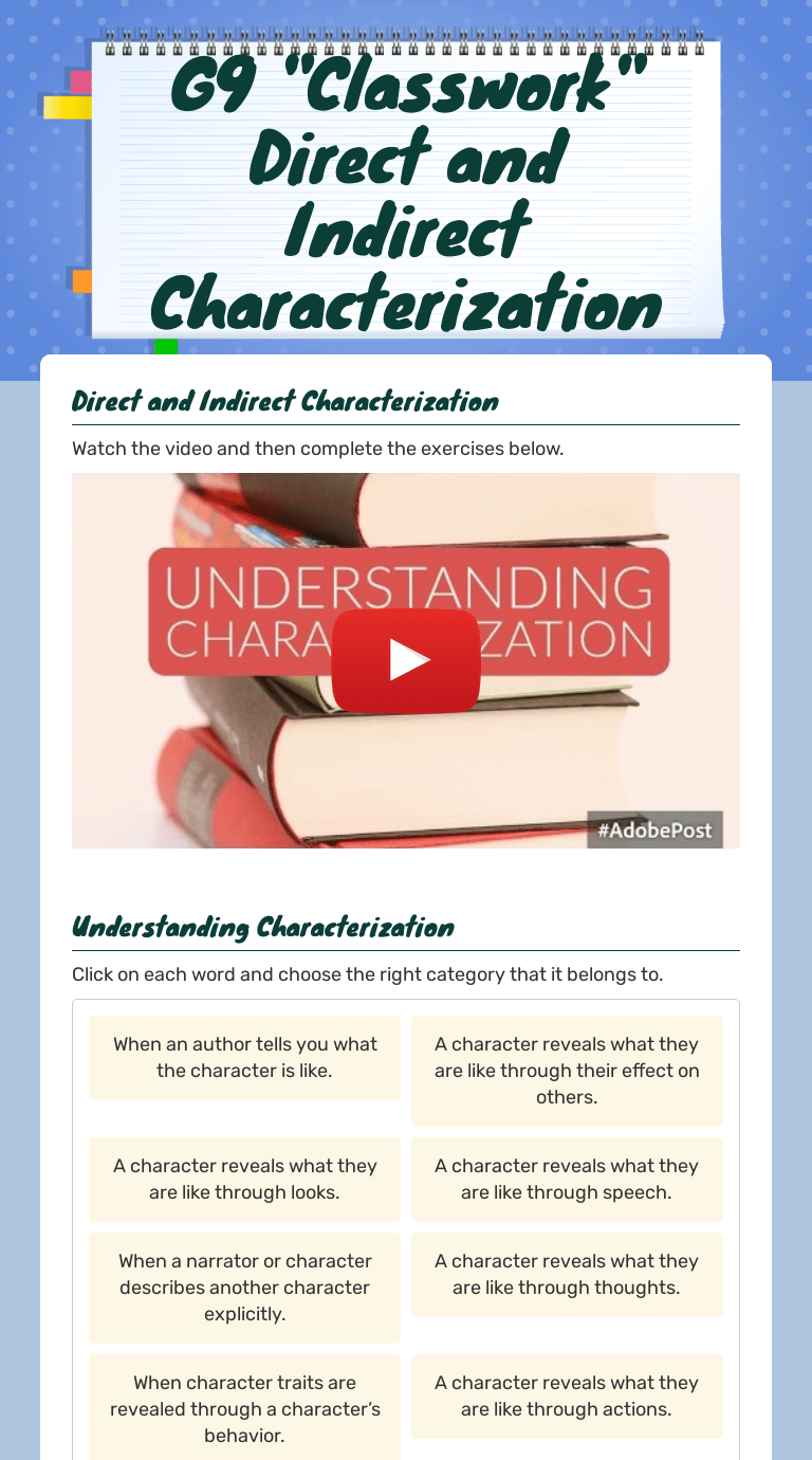 G9 "Classwork" Direct and Indirect Characterization Interactive