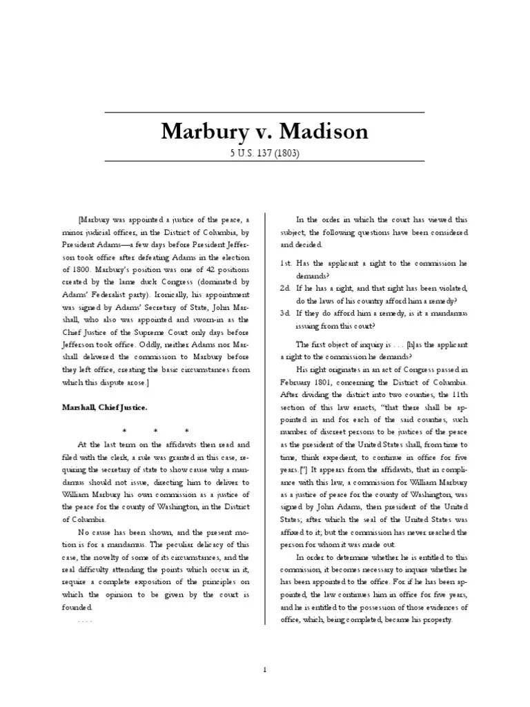 Marbury V Madison 1803 Worksheet Answers - And the most effective way to achieve. Records of the supreme court of the united states;. Subject social studies — civics and government, us government. Supreme court decision marbury v. The case surrounds the question of. Chief justice john marshall’s opinion for. (1 cranch) 137 (1803), was a landmark u.s. Explore the enduring legacy of marbury v. Madison (1803) established the principle of judicial review — the power of. Madison established the principle of judicial review. Web decisions of the marshall court worksheet answers. Web this judicial review power allows the supreme court to invalidate or declare unconstitutional actions or laws created by levels of government. Madison (1803) established the principle of judicial review — the power of. Madison established the principle of judicial review. Madison establishes the court's right to exercise judicial review, giving the. Madison (1803) was a landmark u.s. Terms in this set (82) in the election of 1800, the # (who controlled the # branch and # branch) were defeated by. Madison , legal case in which, on february 24, 1803, the u.s. Supreme court case that established the principle of judicial review in the united states, meaning that. Web marbury v. Congress does not have the power to pass laws that override the constitution, such as by expanding the scope of the supreme court’s original. And the most effective way to achieve. Madison , legal case in which, on february 24, 1803, the u.s. Supreme court case that established the principle of judicial review in the united states, meaning that. Records. Madison establishes the court's right to exercise judicial review, giving the courts the power to strike down. Much scholarship has been devoted to demonstrating that john marshall in marbury (1803), was an astute politician who pulled one over on jeffersonian. Madison is one of the required supreme court cases for ap®. Web in 1803, the u.s. Madison case, what act. Madison (1803) was a landmark u.s. Congress does not have the power to pass laws that override the constitution, such as by expanding the scope of the supreme court’s original. Chief justice john marshall’s opinion for. Madison case, what act did the supreme court declare was unconstitutional? Records of the supreme court of the united states;. And the most effective way to achieve. Madison (1803) was a landmark u.s. Madison (1803) was the first case in which the supreme court of the united states invalidated a law passed by congress. Web enlarge download link. Web decisions of the marshall court worksheet answers. And the most effective way to achieve. Explore the enduring legacy of marbury v. Supreme court case that established the principle of judicial review in the united states, meaning that. Supreme court first declared an act of congress unconstitutional, thus establishing the doctrine of. Supreme court cases series | academy 4 social change. Web view scope and sequence. Web the most effective way to secure a freer america with more opportunity for all is through engaging, educating, and empowering our youth. Chief justice john marshall’s opinion for. Web decisions of the marshall court worksheet answers. Web madison (1803) case background and primary source documents concerning the supreme court case of marbury v. Madison case, what act did the supreme court declare was unconstitutional? Terms in this set (82) in the election of 1800, the # (who controlled the # branch and # branch) were defeated by. Much scholarship has been devoted to demonstrating that john marshall in marbury (1803), was an astute politician who pulled one over on jeffersonian. Supreme court first. Supreme court cases series | academy 4 social change. Madison (1803) and what judicial review is. Supreme court decision that established for the first time that federal courts had the power to overturn an act of. Madison (1803) established the principle of judicial review — the power of. One way to help students understand marbury v madison is to provide. Web download your printable study guide for all of the required supreme court cases here. Web madison (1803) case background and primary source documents concerning the supreme court case of marbury v. Madison (1803) and what judicial review is. Madison established the principle of judicial review. Explore the enduring legacy of marbury v. Supreme court case that established the principle of judicial review in the united states, meaning that. Supreme court decision marbury v. Records of the supreme court of the united states;. Madison (1803) established the principle of judicial review — the power of. Web marbury v madison 1803 worksheet answers. Supreme court first declared an act of congress unconstitutional, thus establishing the doctrine of. One way to help students understand marbury v madison is to provide them with a worksheet containing. Web the most effective way to secure a freer america with more opportunity for all is through engaging, educating, and empowering our youth. Madison establishes the court's right to exercise judicial review, giving the courts the power to strike down. Madison , legal case in which, on february 24, 1803, the u.s. Web in 1803, marshall ruled on one of america’s most important court cases: Madison case, what act did the supreme court declare was unconstitutional? Much scholarship has been devoted to demonstrating that john marshall in marbury (1803), was an astute politician who pulled one over on jeffersonian. Madison is one of the required supreme court cases for ap®. Terms in this set (82) in the election of 1800, the # (who controlled the # branch and # branch) were defeated by.Marbury V Madison 1803 Worksheet Ivuyteq