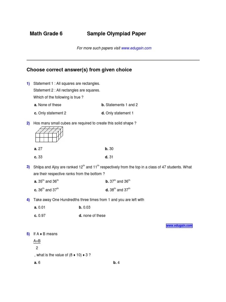 Math Olympiad Class 6 Sample Paper PDF Teaching Mathematics