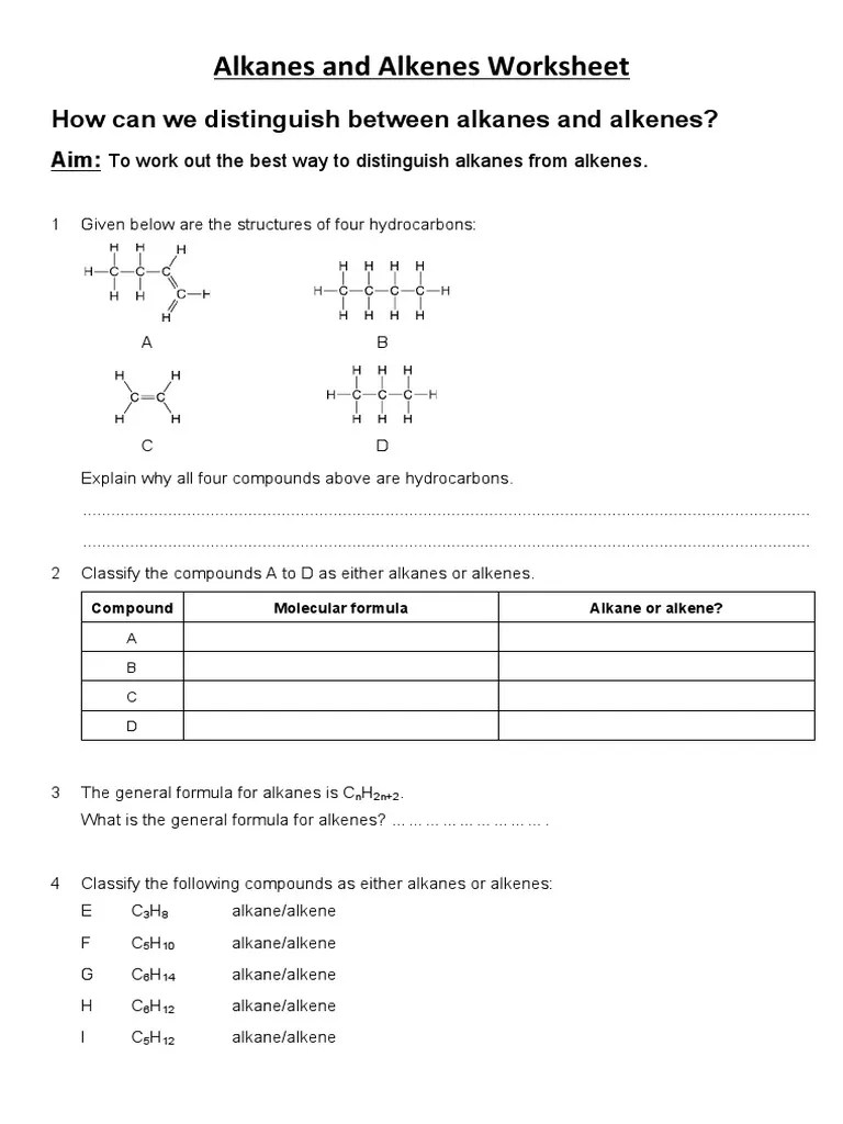 Alkanes and Alkenes Worksheet PDF Alkene Alkane