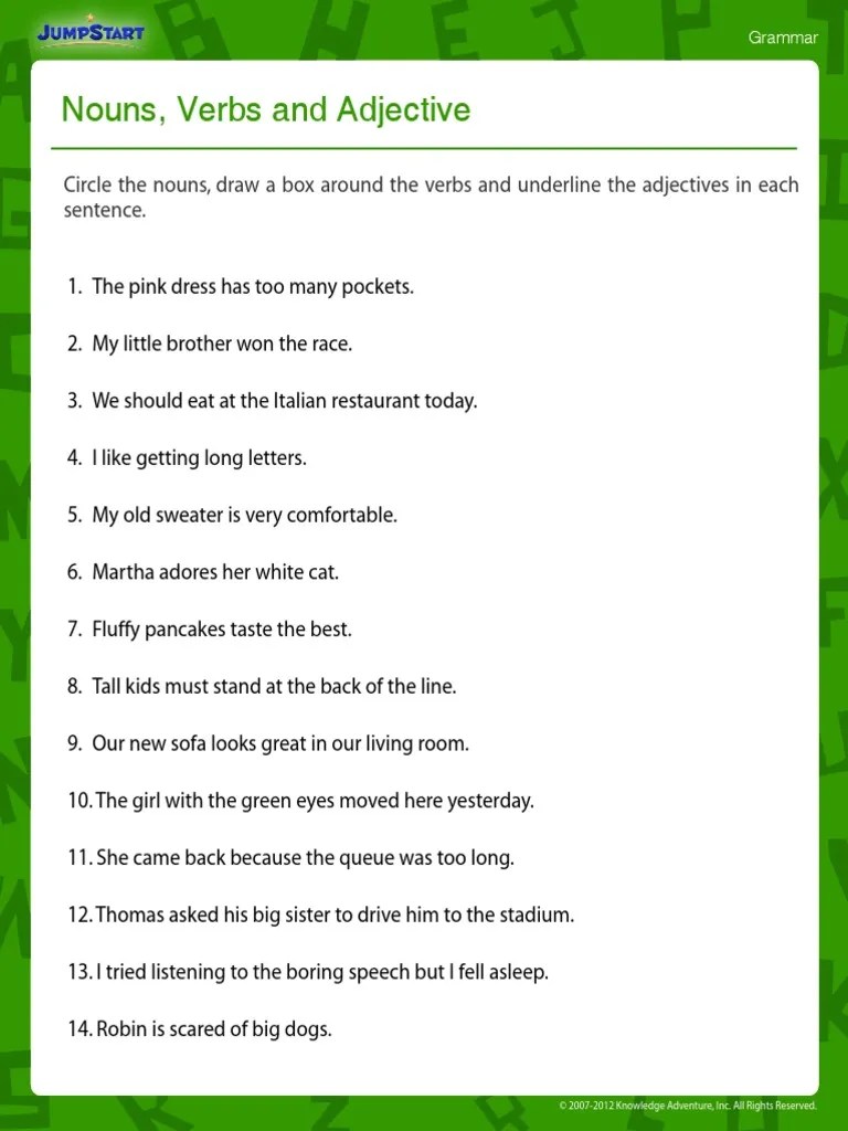 Nouns Verbs Adjectives Worksheet - Enjoy great deals and discounts on an array of products from various brands. This is a complete packet covering all things related to nouns, adjectives and verbs. Students have to sort the words into the categories of nouns, adjectives, verbs and adverbs using a key and then write their own. This book is a bare bones workbook with worksheets. Nouns, verbs, adjectives★ 12 noun sorting cards with pictures and words★ 12 verb. Use this teaching resource when identifying nouns, verbs,. _ _ noun ___ 2. Web docx, 14.81 kb. Noun, adjective, or verb keywords: Web all eight parts of speech are covered in this section: Your students will receive the opportunity to. This is a complete packet covering all things related to nouns, adjectives and verbs. Web noun, adjective, or verb? Grade 3 parts of speech worksheet: Web verbs can be categorized into various forms, such as action verbs (e.g., run, write), helping verbs (e.g., is, have), and linking verbs (e.g., seem, become). Nouns, verbs, adjectives, adverbs, prepositions, interjections, pronouns, and conjunctions. Your students will receive the opportunity to. This worksheet is a fun and engaging way for students to practice. Web a worksheet / activity and lesson plan on identifying nouns, verbs and adjectives. There is a pdf and an editable version of each file. Noun, adjective, or verb keywords: Web nouns and adjectives write nouns for adjectives in these grade 1 grammar worksheets students are given an adjective and are asked to write an appropriate noun. There is a pdf and an editable version of each file. Web all eight parts of speech are covered in this section: This is a complete packet covering. Web parts of speech: _ _ noun ___ 2. Nouns, verbs, adjectives★ 12 noun sorting cards with pictures and words★ 12 verb. Web a worksheet / activity and lesson plan on identifying nouns, verbs and adjectives. Edit, sign and save k5learning grade 3 using nouns form. Web nouns, verbs and adjectives nouns, verbs and adjectives b1s member for 3 years age: Use this teaching resource when identifying nouns, verbs,. Grade 3 parts of speech worksheet: Enjoy great deals and discounts on an array of products from various brands. Web all eight parts of speech are covered in this section: Noun, adjective, or verb keywords: Your students will receive the opportunity to. There is a pdf and an editable version of each file. Web a worksheet / activity and lesson plan on identifying nouns, verbs and adjectives. Noun, adjective, or verb worksheet author: _ _ noun ___ 2. Web nouns, verbs and adjectives nouns, verbs and adjectives b1s member for 3 years age: Nouns, verbs, adjectives, adverbs, prepositions, interjections, pronouns, and conjunctions. Web worksheets match nouns, verbs, adverbs, and adjectives match nouns, verbs, adverbs, and adjectives grace cord member for 1 year 11 months age: This book is a bare bones workbook with. Web verbs, nouns, adjectives and adverbs introduction this parts of speech worksheet helps students learn how to identify verbs, nouns, adjectives, and adverbs and use them in. Web docx, 14.81 kb. This worksheet is a fun and engaging way for students to practice. Edit, sign and save k5learning grade 3 using nouns form. Ad explore the world of diverse topics. Web a worksheet / activity and lesson plan on identifying nouns, verbs and adjectives. This book is a bare bones workbook with worksheets. Nouns, verbs, adjectives★ 12 noun sorting cards with pictures and words★ 12 verb. Web verbs, nouns, adjectives and adverbs introduction this parts of speech worksheet helps students learn how to identify verbs, nouns, adjectives, and adverbs and. Nouns, verbs, adjectives, adverbs, prepositions, interjections, pronouns, and conjunctions. Web nouns and adjectives write nouns for adjectives in these grade 1 grammar worksheets students are given an adjective and are asked to write an appropriate noun. Web verbs can be categorized into various forms, such as action verbs (e.g., run, write), helping verbs (e.g., is, have), and linking verbs (e.g.,. Web explore more than 620 nouns verbs adjectives worksheets resources for teachers, parents and pupils as well as related resources on noun verb adjective worksheet. Nouns, verbs, adjectives★ 12 noun sorting cards with pictures and words★ 12 verb. Grade 3 parts of speech worksheet: This book is a bare bones workbook with worksheets. Web verbs, nouns, adjectives and adverbs introduction this parts of speech worksheet helps students learn how to identify verbs, nouns, adjectives, and adverbs and use them in. Your students will receive the opportunity to. Web parts of speech: Students have to sort the words into the categories of nouns, adjectives, verbs and adverbs using a key and then write their own. Enjoy great deals and discounts on an array of products from various brands. Web nouns, verbs and adjectives nouns, verbs and adjectives b1s member for 3 years age: There is a pdf and an editable version of each file. This worksheet is a fun and engaging way for students to practice. Web a worksheet / activity and lesson plan on identifying nouns, verbs and adjectives. Ad signnow allows users to edit, sign, fill & share all type of documents online. Edit, sign and save k5learning grade 3 using nouns form. Noun, adjective, or verb worksheet author: Web nouns, adjectives and verbs (and more!)this is a complete packet covering all things related to nouns, adjectives and verbs. Nouns, verbs, adjectives, adverbs, prepositions, interjections, pronouns, and conjunctions. Web worksheets match nouns, verbs, adverbs, and adjectives match nouns, verbs, adverbs, and adjectives grace cord member for 1 year 11 months age: Web docx, 14.81 kb.verbs printable worksheet pack kindergarten first second pin by