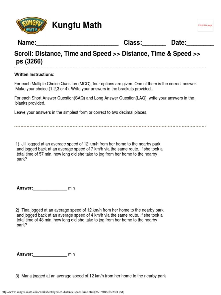 Singapore Math Worksheets Grade 6 Distance, Speed and Time Quality Of