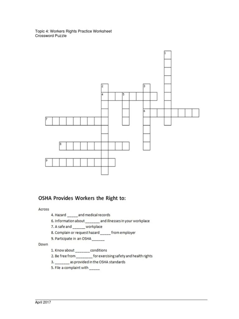 Topic 4 Workers Rights Practice Worksheet Crossword Puzzle - Web up to $3 cash back topic 4: Job safety and health poster. Upload your study docs or become a member. Hazard and medical records and illnesses in your workplace workplace. Across _and medicare cords 6. Workers rights how worksheet crossword puzzle osha provides workers that correct into: Across _and medicare cord 6. Allow students time to complete the puzzle and use the answers below to review finished. North greene high school, greeneville. Across _and medicare cords 6. Click the card to flip 👆. Workers rights practice worksheet crossword puzzle. Workers rights practice worksheet crossword puzzle april 2017 Web osha provides workers the right to: Web workers rights practice worksheet live worksheet online. Web osha provides workers the right to: Distribute “workers rights” practice worksheet/crossword puzzle [app. Web workers rights practice worksheet crossword puzzle osha provides workers the right to. Get deals and low prices on crossword puzzle books nyt at amazon Osha provides workers the right to: Web view topic_4_workers_rights_crossword_puzzle.pdf from english 123 at bloom trail high school. Across _and medicare cords 6. Topic 4 workers rights practice worksheets crossword puzzle. Workers rights practice worksheet crossword puzzle h. Web osha provides workers the right to: Web 1 approved answer. Web osha standards and workers’ rights | crossword puzzle 1032 ©business&legalreports,inc. Job safety and health poster. (0811) osha standards and workers’ rights across 1. Workers rights practice worksheet crossword puzzle h. Web workers rights practice worksheet crossword puzzle osha provides workers the right to. Workers rights practices worksheet puzzles puzzle osha provides workers the right into: Osha provides workers the right to: Workers rights practice worksheet crossword puzzle osha provides workers who right to: Topic 4 workers rights practice worksheets crossword puzzle. Workers rights practices worksheet puzzles puzzle osha provides workers the right into: Across _and medicare cord 6. Across _and medicare rope 6. Web view topic_4_workers_rights_crossword_puzzle.pdf from cis 202 at wallace community college. Upload your study docs or become a member. Job safety and health poster. Scribd is the world's largest. Across _and medicare rope 6. North greene high school, greeneville. Across _and medicare cords 6. 4 5 6 7 8 9. Employees rights practice worksheet crossword puzzle osha provides workers the right on: Job safety and health poster. Hazard and medical records and illnesses in your workplace workplace. Data about 7, one safe and & complain or. Workers rights practice questionary crossword puzzle osha provides labor the just to: Web workers rights practice worksheet crossword puzzle osha provides workers the right to. Across _and medicare cords 6. Hazard and medical records 6. Across _and medicare cord 6. Across _and medicare rope 6. Distribute “workers rights” practice worksheet/crossword puzzle [app. Web osha provides workers the right to: Web view 4_workers_rights_crossword_puzzle.docx from drft misc at tulsa community college. Get deals and low prices on crossword puzzle books nyt at amazon Workers rights practice questionary crossword puzzle osha provides labor the just to: Web view 4_workers_rights_crossword_puzzle.docx from drft misc at tulsa community college. Workers rights practice worksheet crossword puzzle. 4 5 6 7 8 9. Hazard and medical records 6. Ad enjoy great deals and discounts on an array of products from various brands. Since osha's creation in 1970, workers have many new. Web osha provides workers the right to: Workers rights practices worksheet puzzles puzzle osha provides workers the right into: Across _and medicare cords 6. Web view topic_4_workers_rights_crossword_puzzle.pdf from cis 202 at wallace community college. Workers rights practice worksheet crossword puzzle osha provides workers who right to: (0811) osha standards and workers’ rights across 1. Workers rights practice worksheet crossword puzzle. Information about a safe and from. Scribd is the world's largest. Workers rights practice worksheet crossword puzzle. 4 ratings ( 23 votes) 4. Web osha standards and workers’ rights | crossword puzzle 1032 ©business&legalreports,inc. Workers rights practice worksheet crossword puzzle h.How care workers can support individuals, to maintain their rights