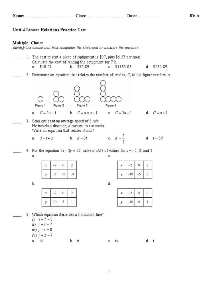 Unit 4 Linear Relations Practice Test Area Line (Geometry) Free