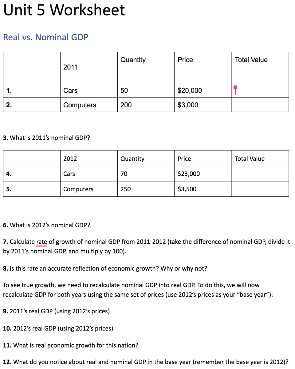 Solved Unit 5 Worksheet Real vs. Nominal GDP Quantity Price